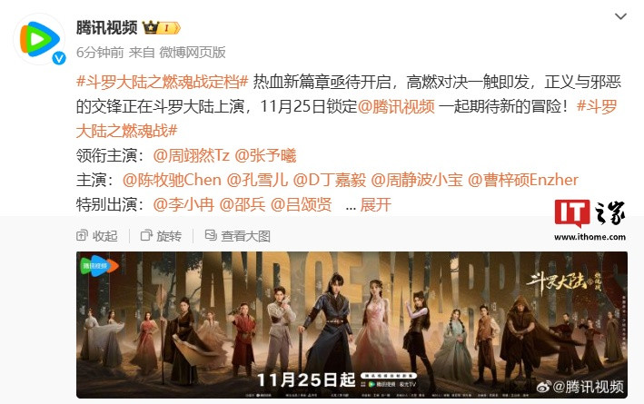 发布日期:2025-04-22 10:28 点击次数:69IT之家11月19日音信,腾讯视频官方当天发文秘书,其好处剧集《斗罗大陆之燃魂战》定档11月25日上映欧洲杯体育,该剧集改编自同名演义《斗罗大陆》。