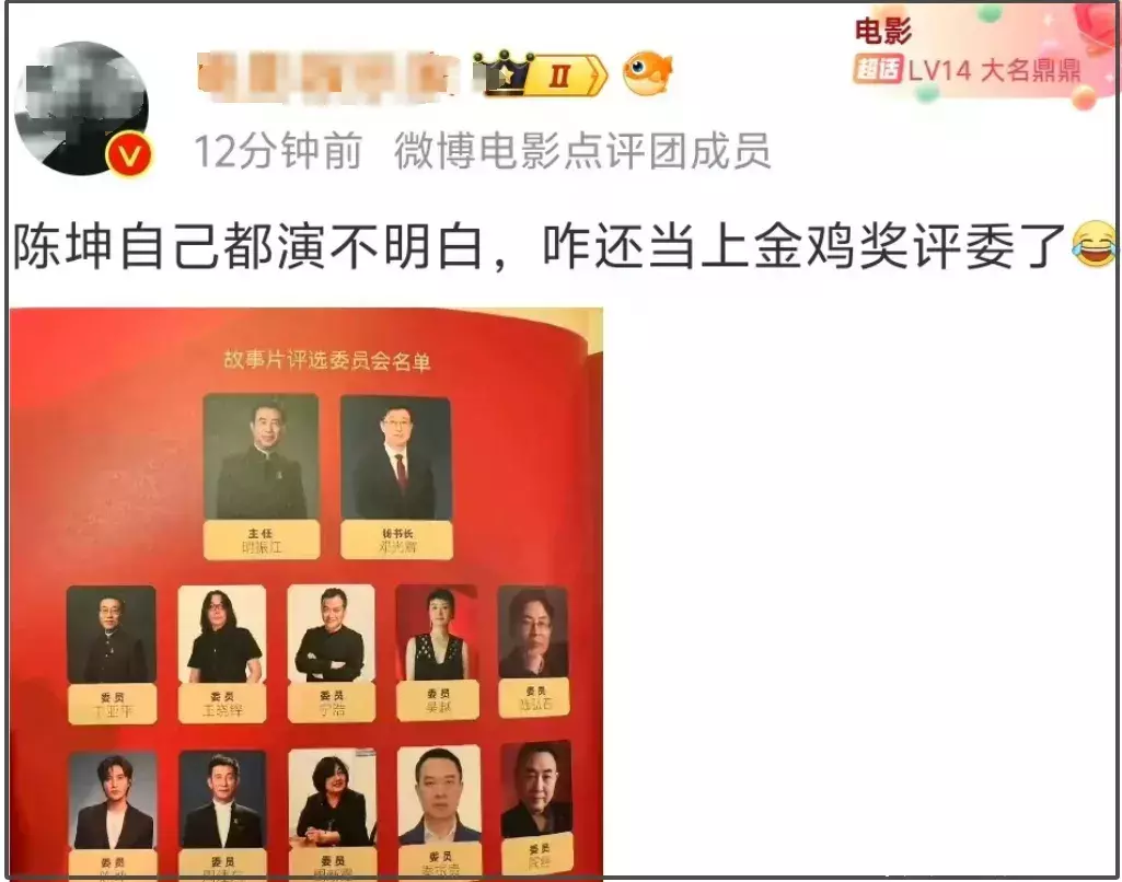 其次陈坤就算群嘲出圈,然则就实绩而言,他要作品有作品、要经典变装有经典变装,退一万步讲,王一博和范丞丞都提名金鸡奖了,陈坤还不成当评委吗?