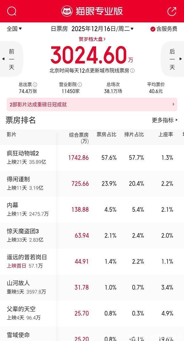 【数字飙榜,单日票房】 2025年12月16日(周二)大盘票房3024.60万东谈主民币; TOP1拜伦·霍华德、杰拉德·布什和瑞奇·摩尔导演,杰森·贝特曼、金妮弗·古德温、关继威和福琼·费姆斯特英语原版配音,大鹏、金晨、王安宇和费翔等国语配音的动画片《猖獗的动物城2》当日票房1742.86万,位列单日票房榜冠军,票房占比57.6%,排片占比57.7%,上座率1.3%,上映21天累计票房35.89亿东谈主民币。