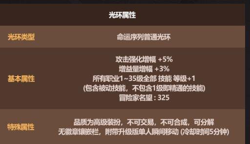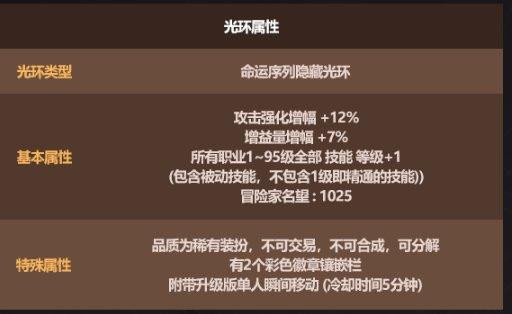每套支持的光环强度较低,名望为325点,无法嵌入徽章仅能算作过渡使用,至尊光环属性突出于24/25的国庆光环,是现在最强的光环。