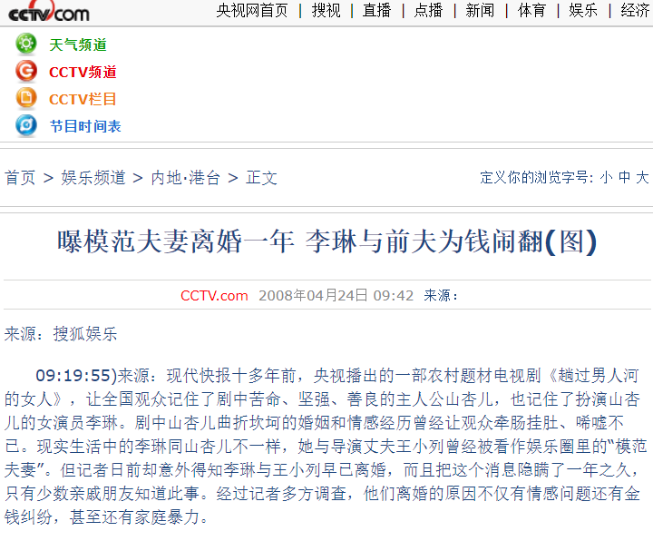 CCTV央视网2008.4.24 【曝圭臬配偶仳离一年 李琳与前夫为钱离散(图)】