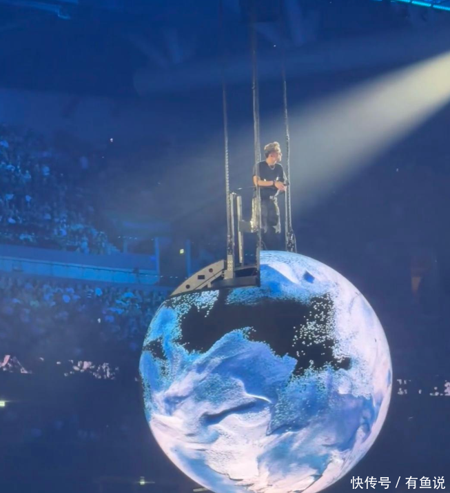 献艺中,他跳进一个巨型球体,升到三层楼高,悬浮在不雅众席上方,边唱《边走边爱》边与粉丝互动,现场歧视炸裂。
