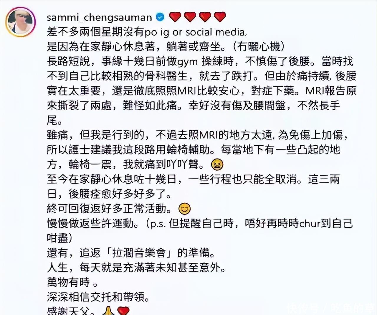 在翰墨中,郑秀文说我方之是以受伤,是十几天前健身时不戒备所致。那时找不到我方相熟的骨科大夫,就去了跌打,但疾苦依然握续,为了释怀,决定要去病院作念核磁共振,还好着力无大碍。郑秀文还说,尽管她也能我方强撑着行走,但照顾照旧冷落她乘坐轮椅。别东说念主推着交运,要是遭受大地上有些微险峻情况,她就疼得呲牙咧嘴。