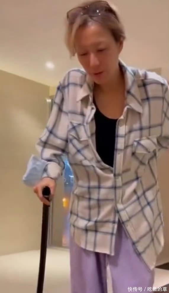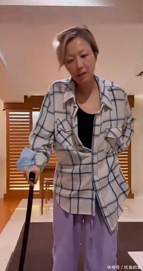 拄手杖走路时,郑秀文一步一步齐很笨重,还要扶着腰、忍着疼。