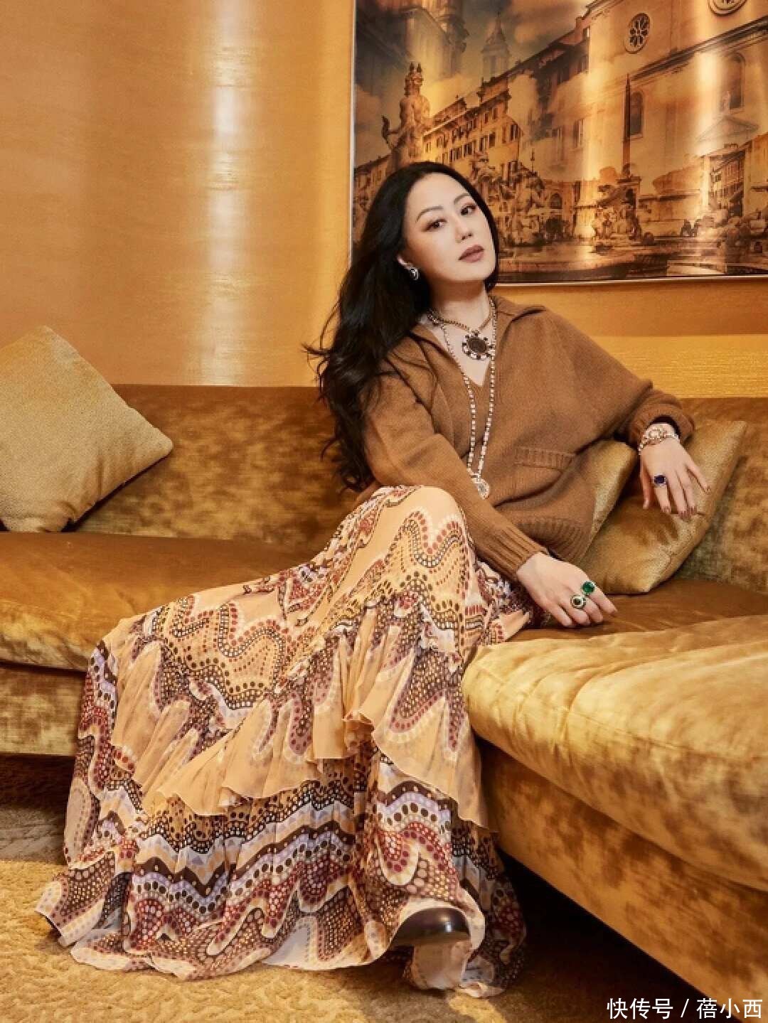 再来说说腿上穿的这条半身裙,其以卡其色面料为底层,裙身能看到波涛纹图案,继而让裙摆自带层叠感,宛如一幅流动的油画。坐着时裙摆构兵到大地,是以不是那种短裙。再加上裙摆松量多多,因此,你如果穿上它,步碾儿时一定会有英俊感。