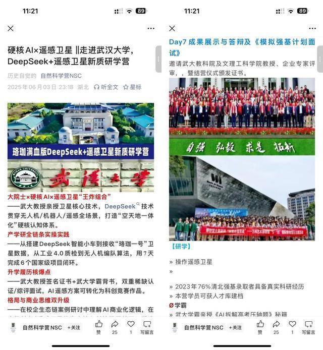 “当然科学营NSC”还深切有6月3日发布的“硬核AI×遥感卫星丨丨走进武汉大学”的研学营行为。