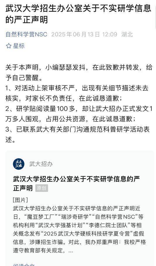 声明称,近日,“魔豆梦工场”“瑞涉奇研学”“当然科学营NSC”等机构期骗“武汉大学强基计算”“李德仁院士团队”等干系倡导发布“2025武汉大学硬核科技研学夏季营”失实信息,涉嫌招生诳骗。
